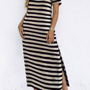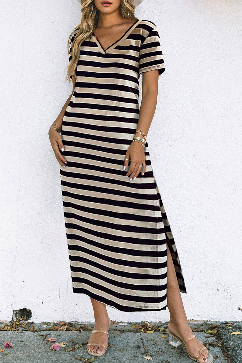 - Make the jaw drop when you strut by in this stripe t-shirt maxi dress