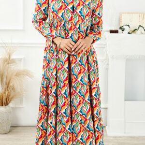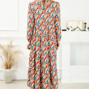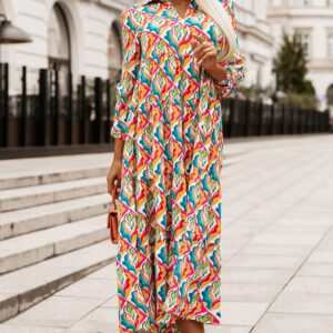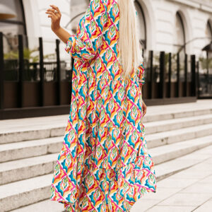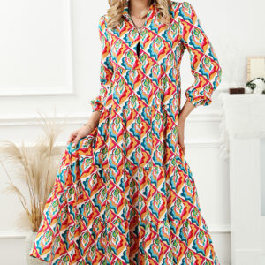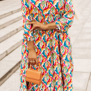 Multicolor Abstract Geometric Print Long Sleeve High Waist Dress