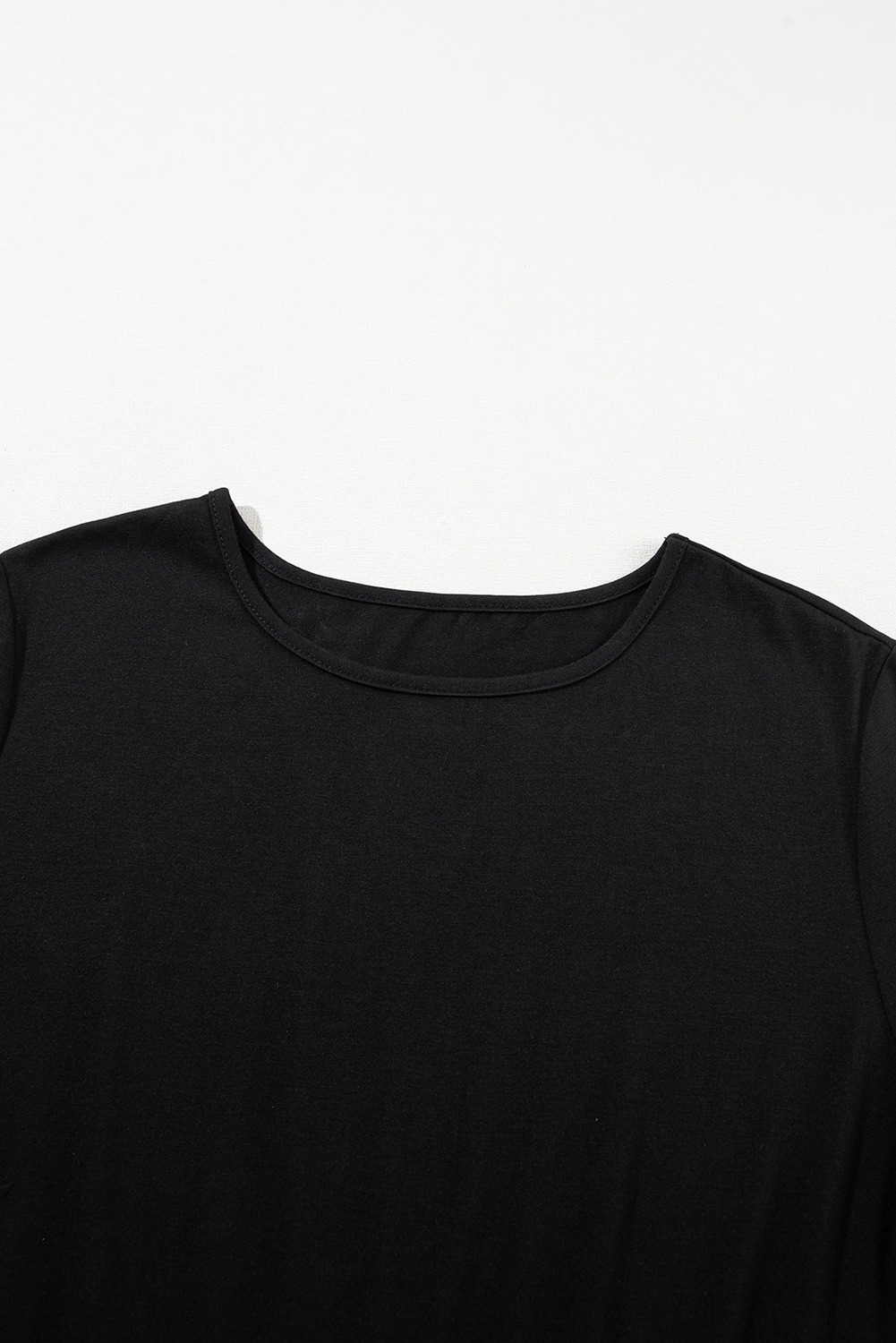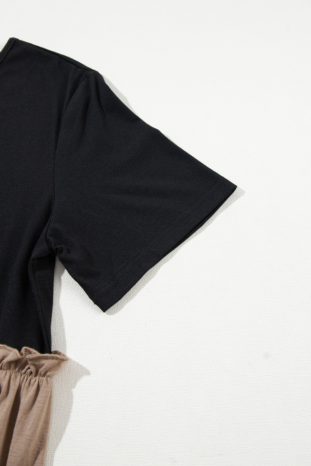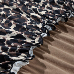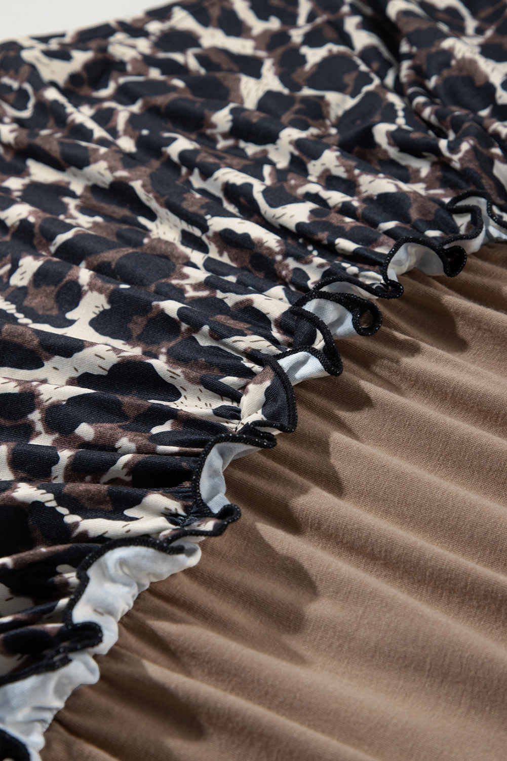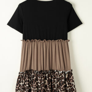 This short dress features a leopard print pattern and contrasting colorblock silhouette