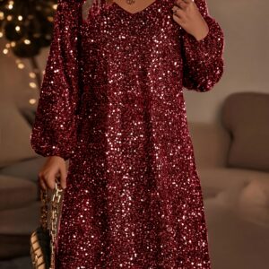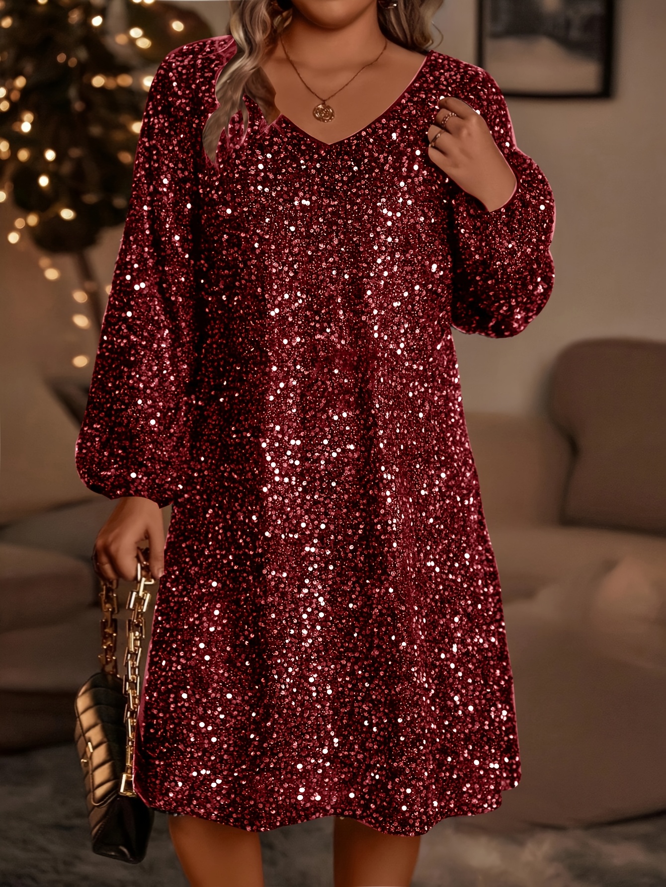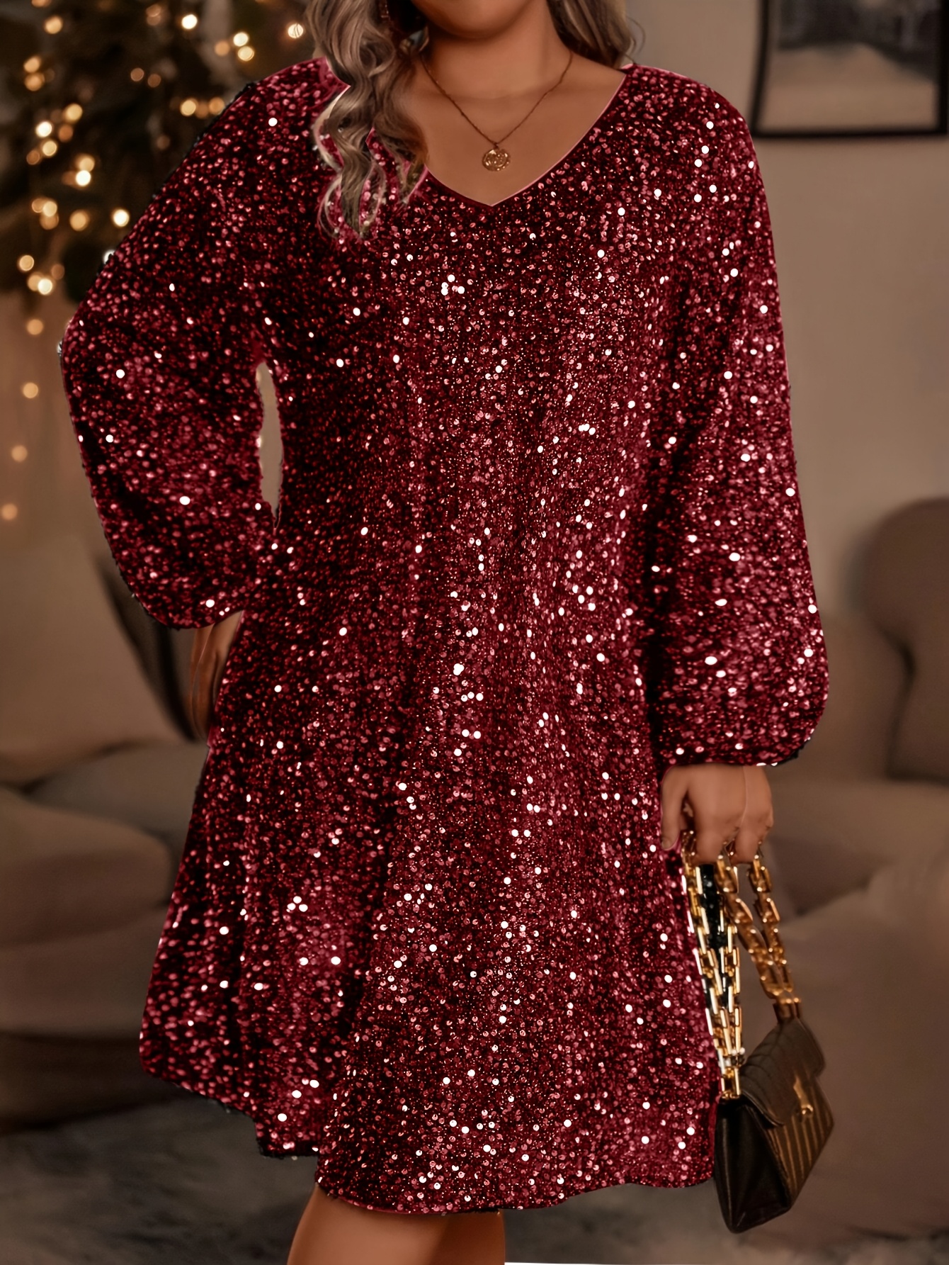 Plus Size – Bubble Sleeve V Neck Sequin Dress