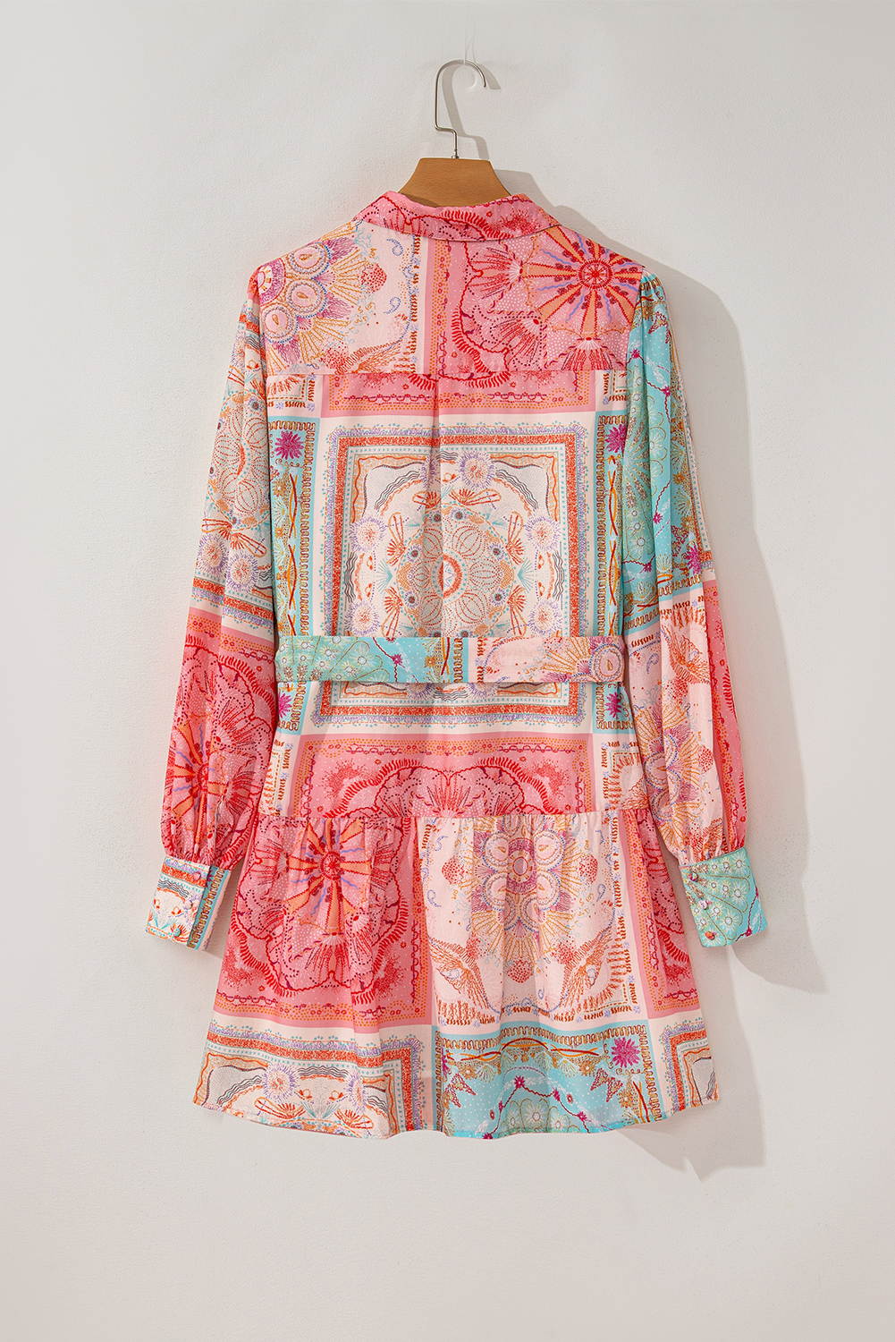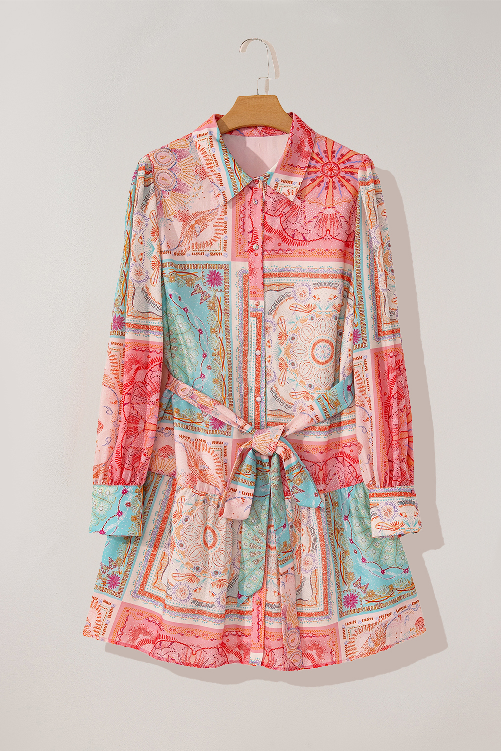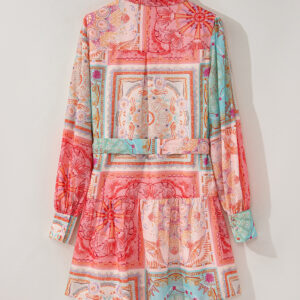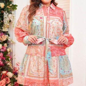 Pink Patchwork Print Bubble Sleeves Belted Plus Size Dress
