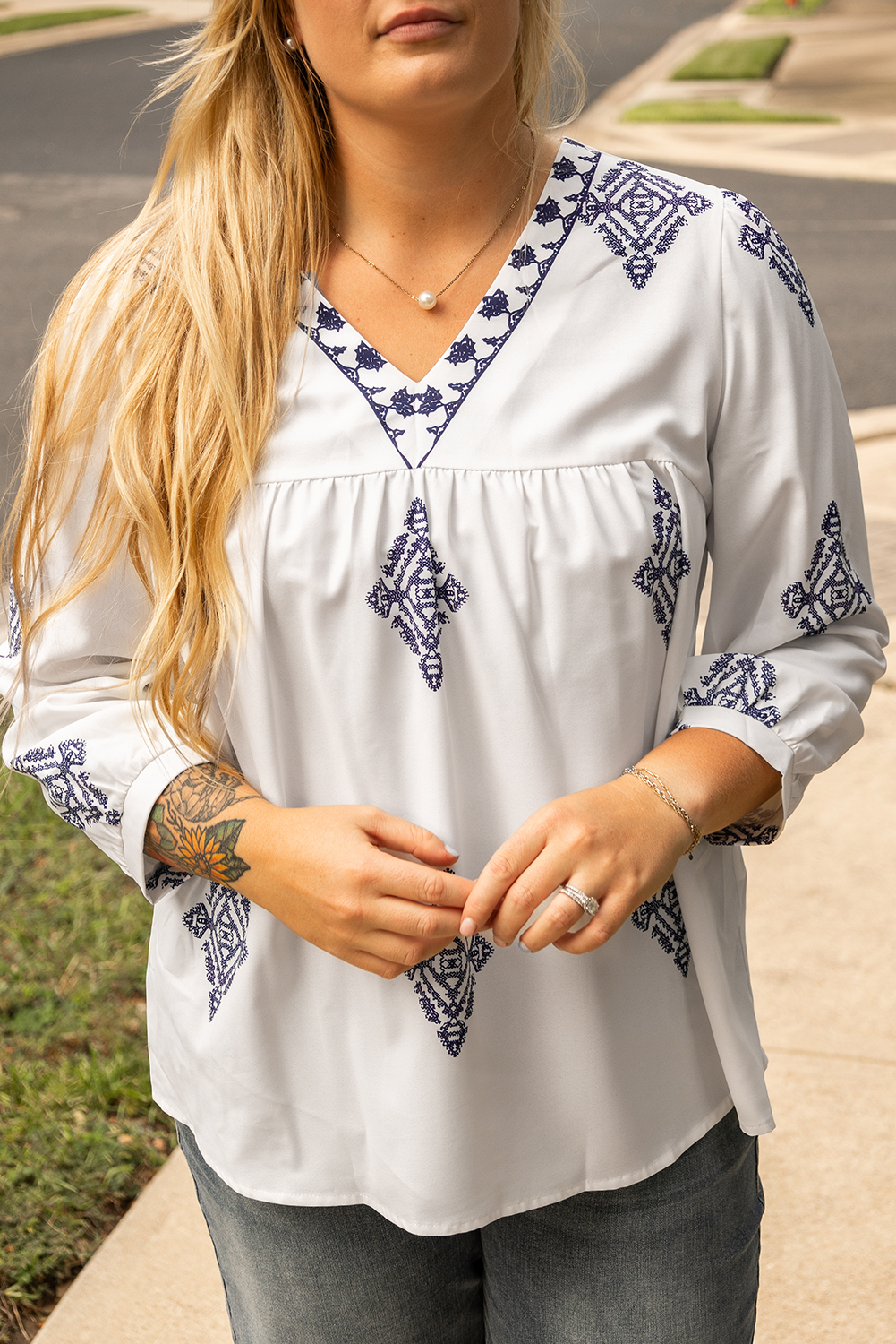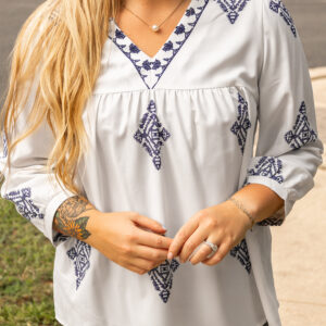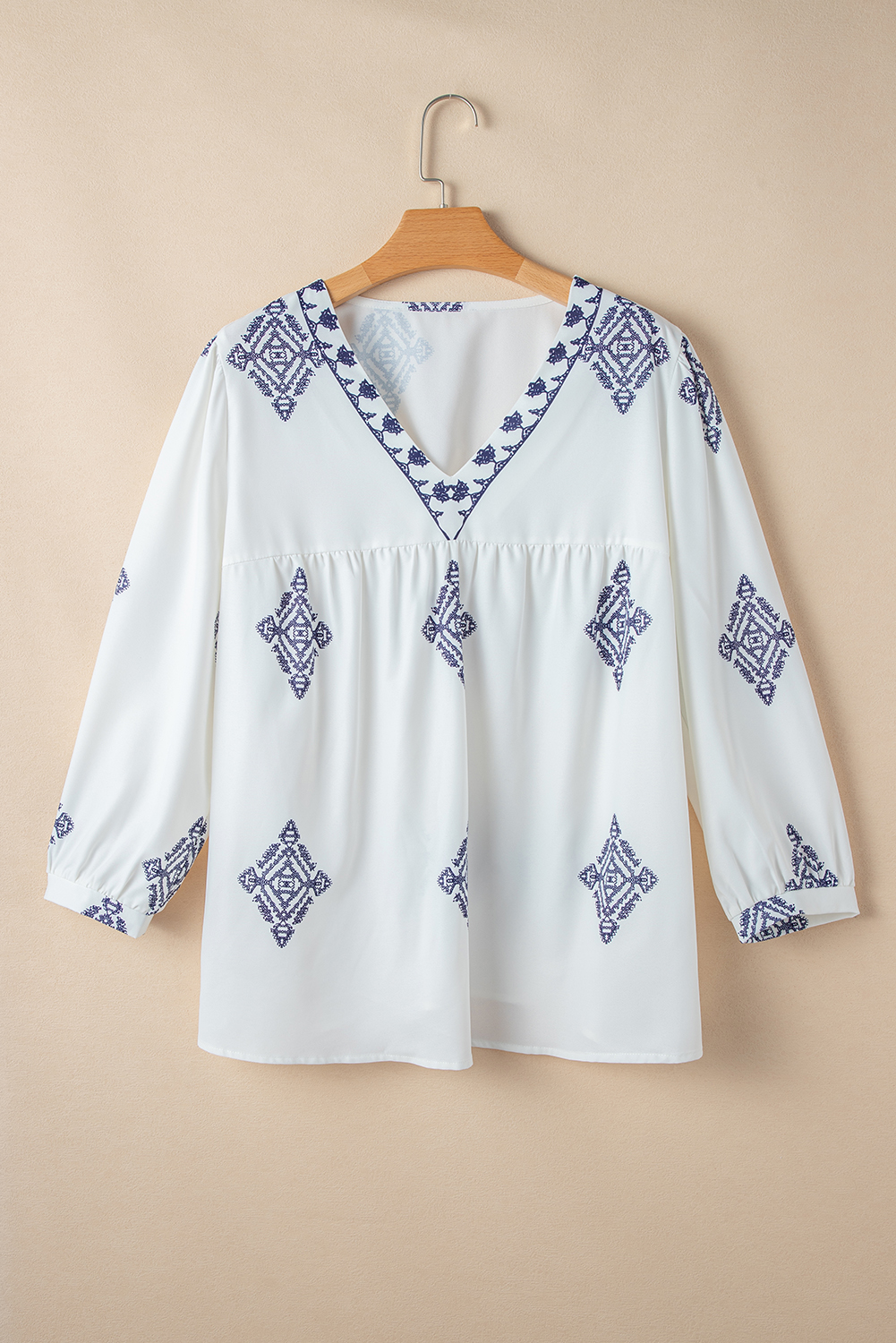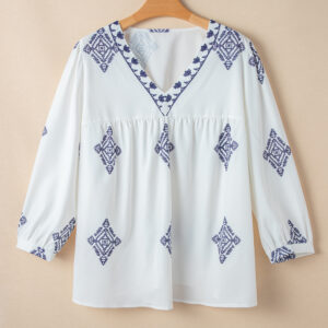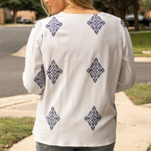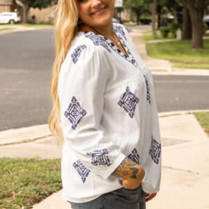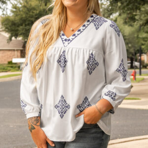 - This plus size blouse designed in a boho chic with unique geometric pattern.