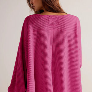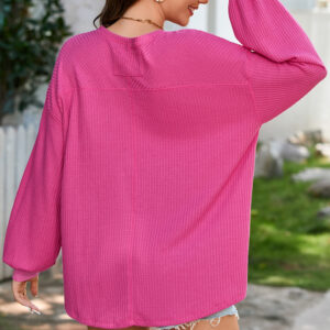 Bright Pink Waffle V Neck Long Sleeve Drop Shoulder Loose Blouse