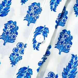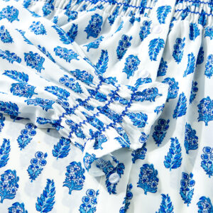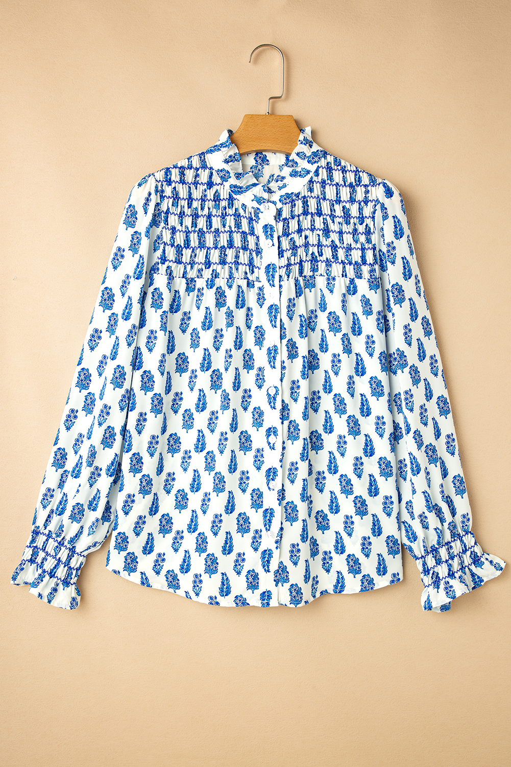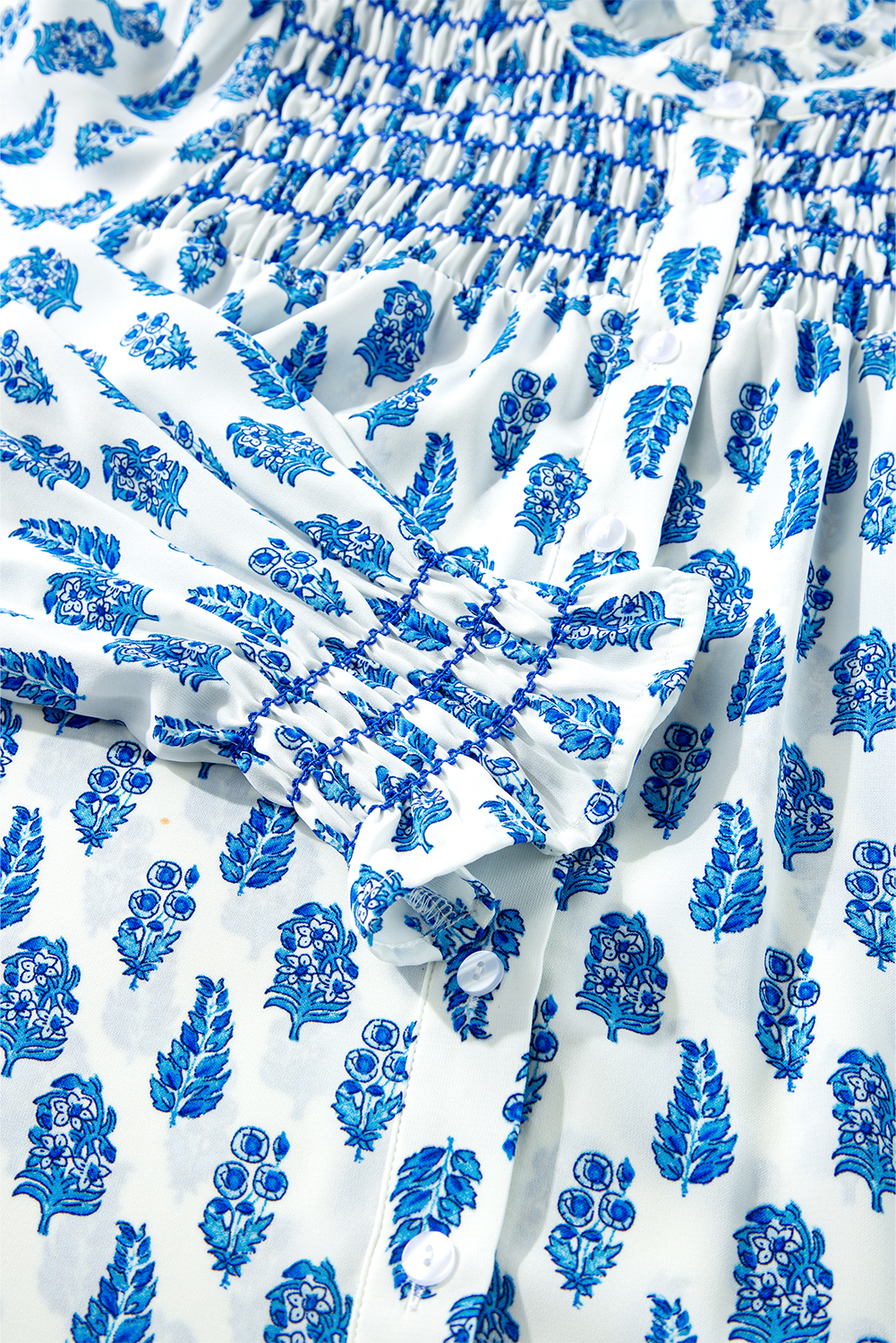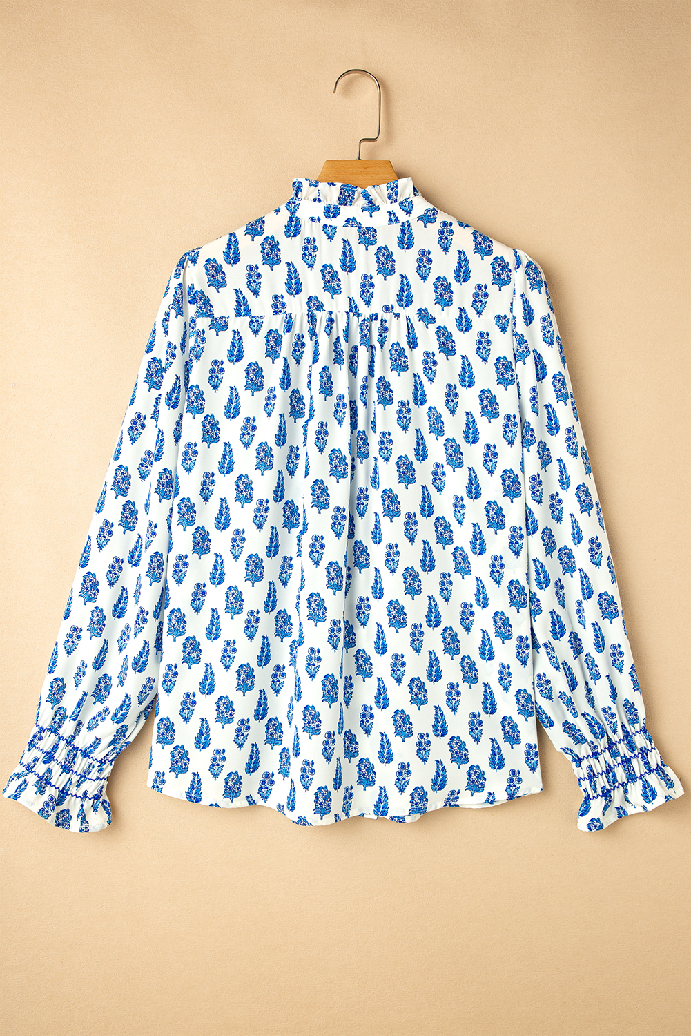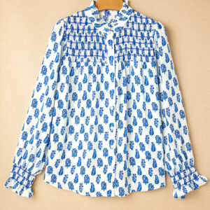 Sky Blue Boho Floral Printed Lantern Sleeve Frilled Neck Shirred Shirt